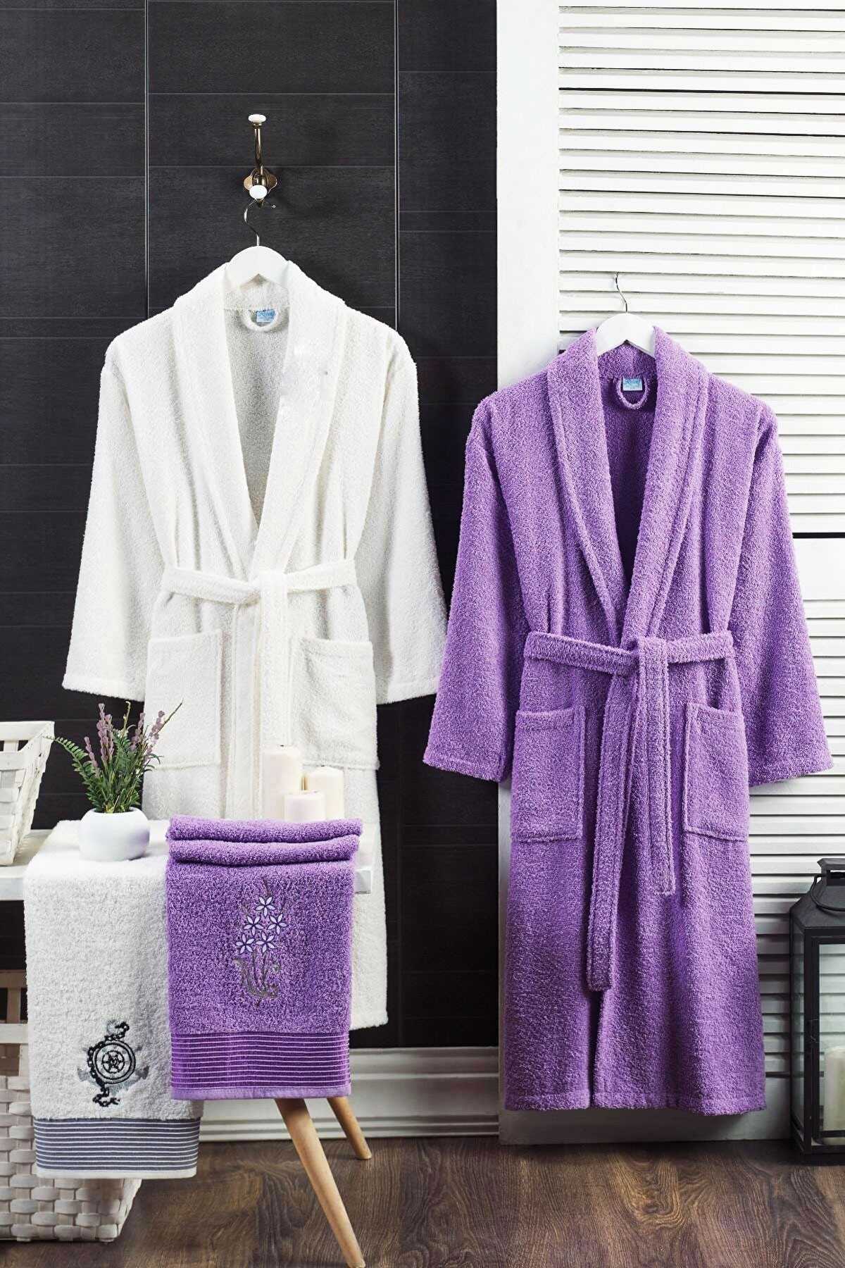 4 Parça Aile Bornoz Seti Kadın Erkek Havlulu Bornoz Takımı 100 Beyaz Lavanta