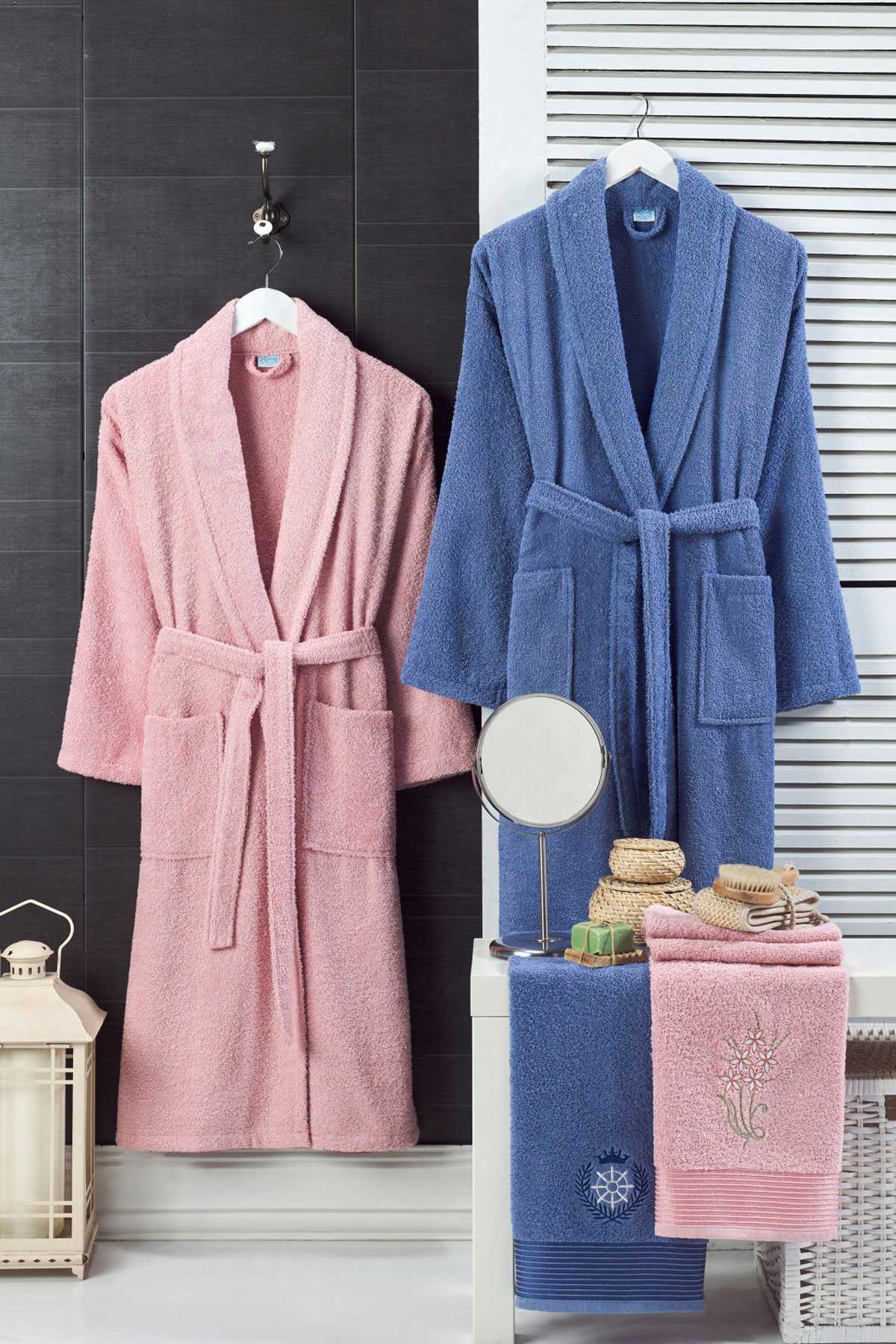 4 Parça Aile Bornoz Seti Kadın Erkek Havlulu Bornoz Takımı %100 lacivert pembe