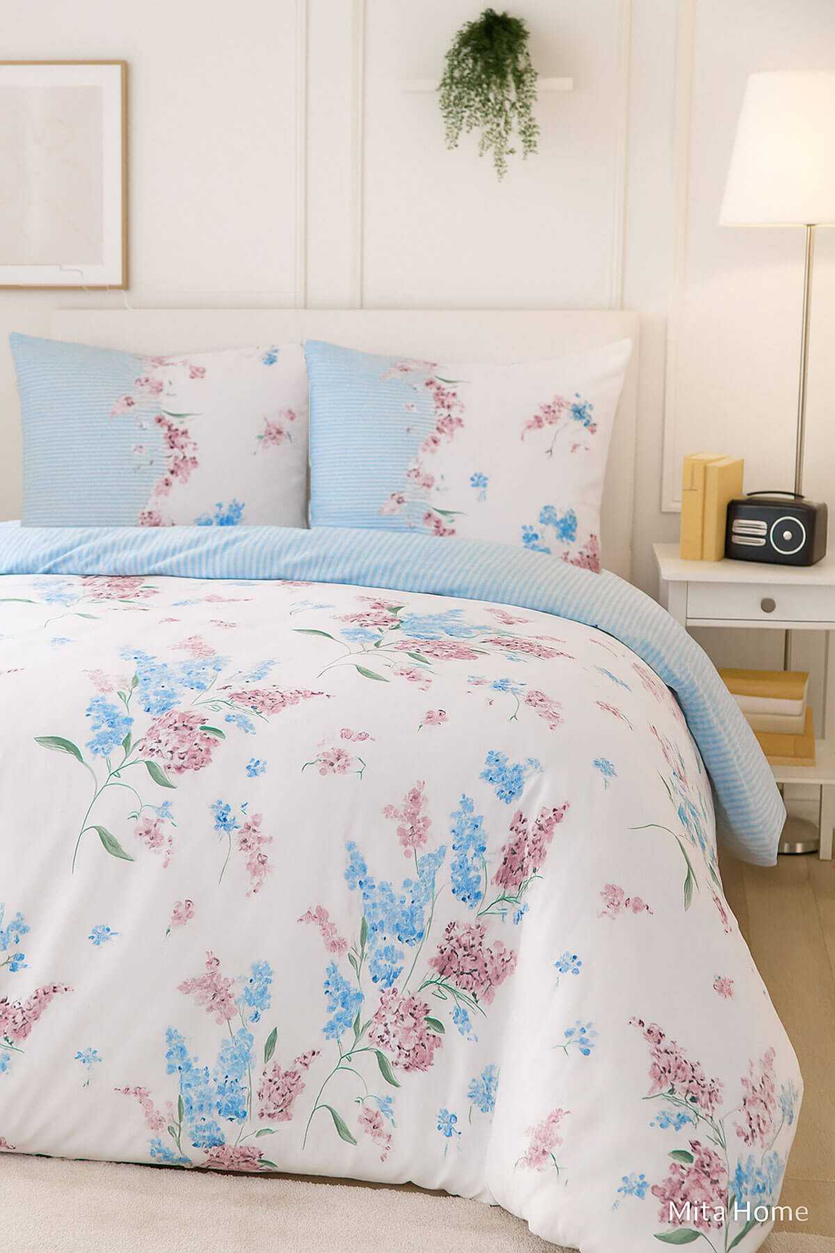Çift Kişilik Pamuklu Nevresim Takımı Mavi Çiçek Desenli