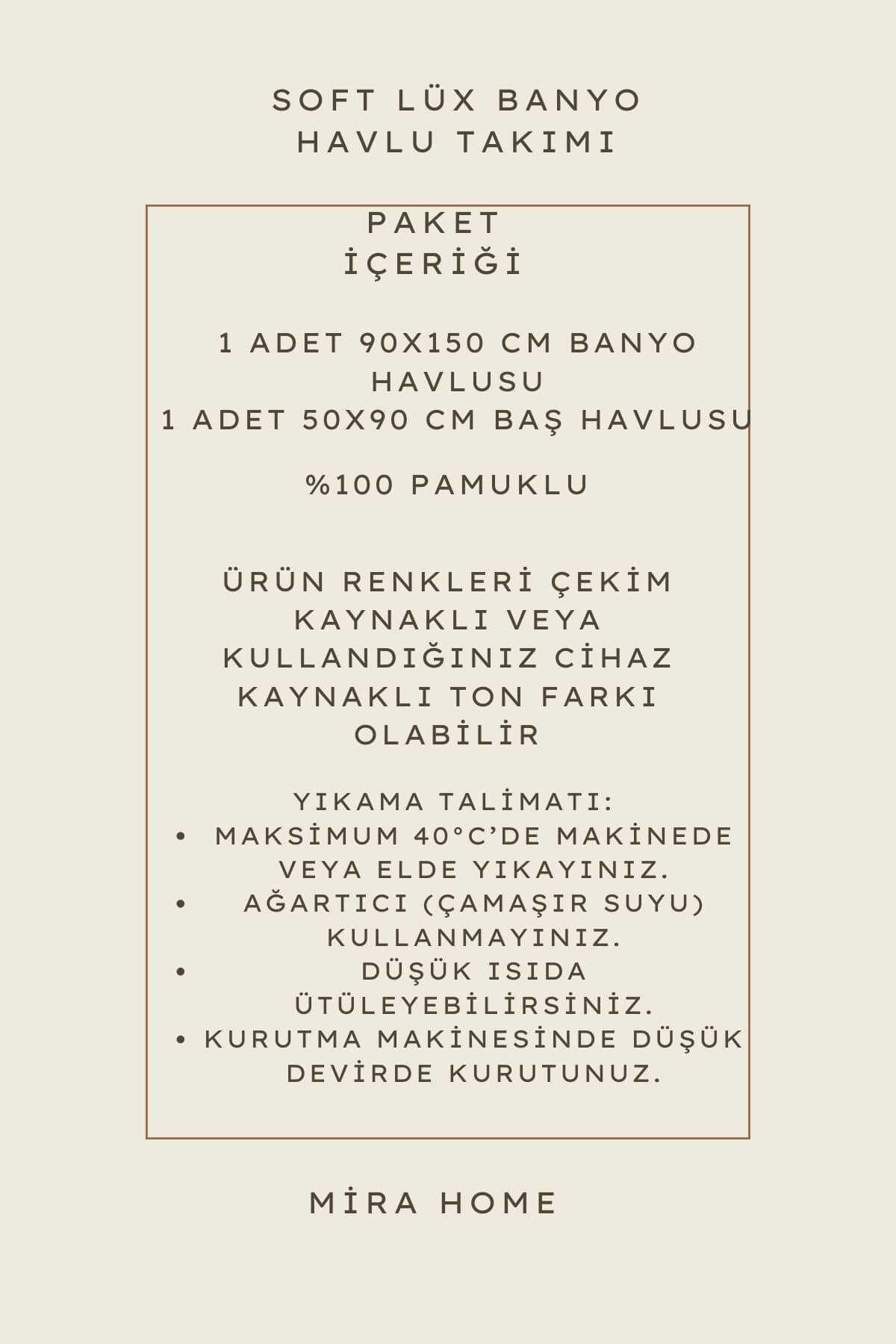 Banyo keyfinizi konforla buluşturan 2 Parça %100 Pamuklu Soft Lüks Banyo Havlu Seti, yüksek emiciliği ve yumuşak dokusuyla öne çıkıyor. %100 pamuklu yapısı sayesinde cildinize dosttur ve uzun süreli kullanım için idealdir. Set içerisinde 1 adet 90x150 cm banyo havlusu ve 1 adet 50x90 cm baş havlusu bulunmaktadır. Kaliteli dokuması sayesinde suyu hızla emer ve kolay kurur. Modern ve şık tasarımıyla banyonuza zarafet katar.