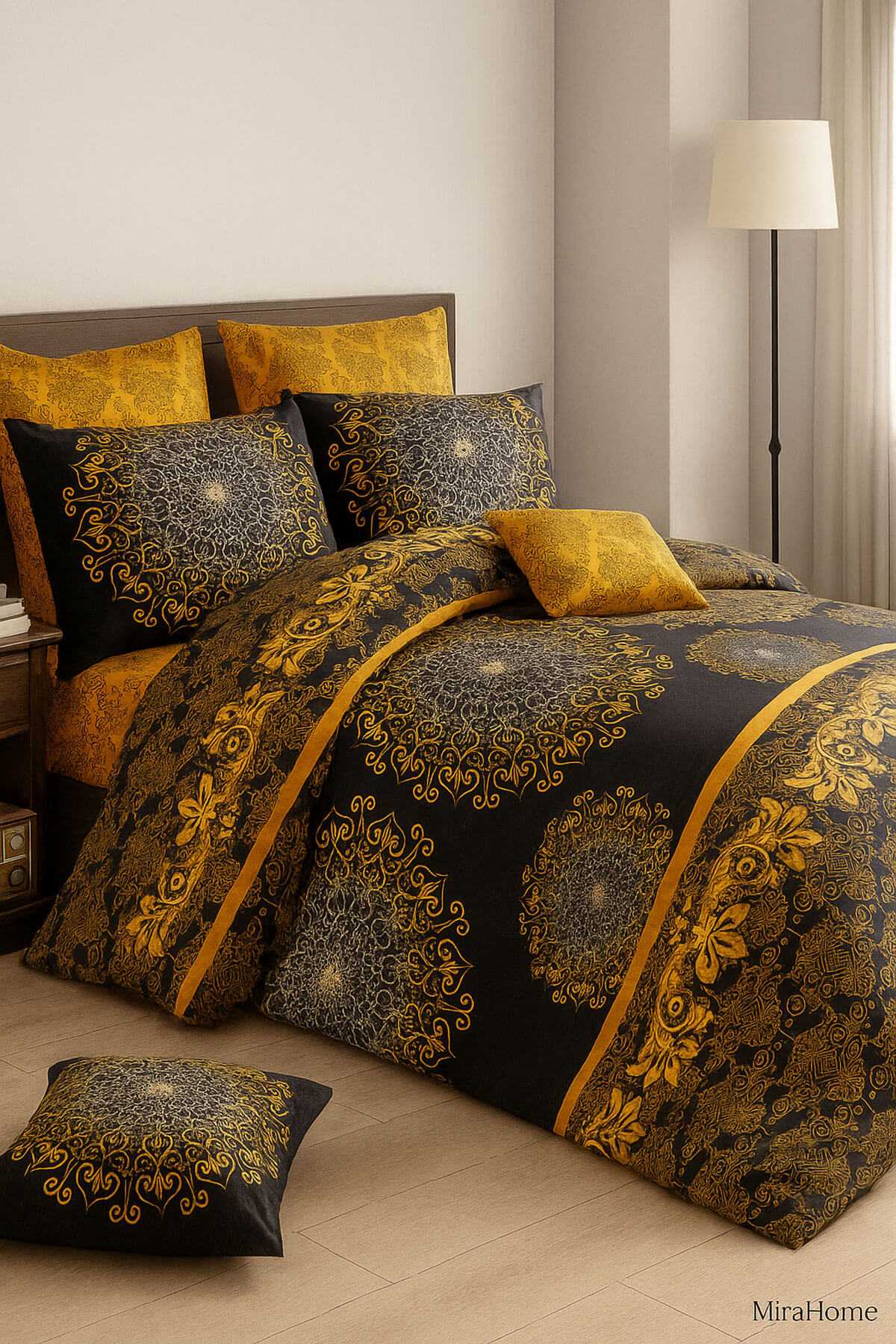 Şıklığı ve gösterişi yatak odanıza taşıyan Mira Home Varaklı Desenli Nevresim Takımı, göz alıcı siyah ve sarı tonlarının zarif birleşiminden oluşuyor. Altın varak desenlerinden ilham alınarak tasarlanan bu özel takım, odanıza lüks ve sofistike bir hava katıyor. %70 pamuk ve %30 polyester kumaşı sayesinde hem yumuşacık bir dokunuş sunar hem de dayanıklılığıyla uzun ömürlü kullanım sağlar.