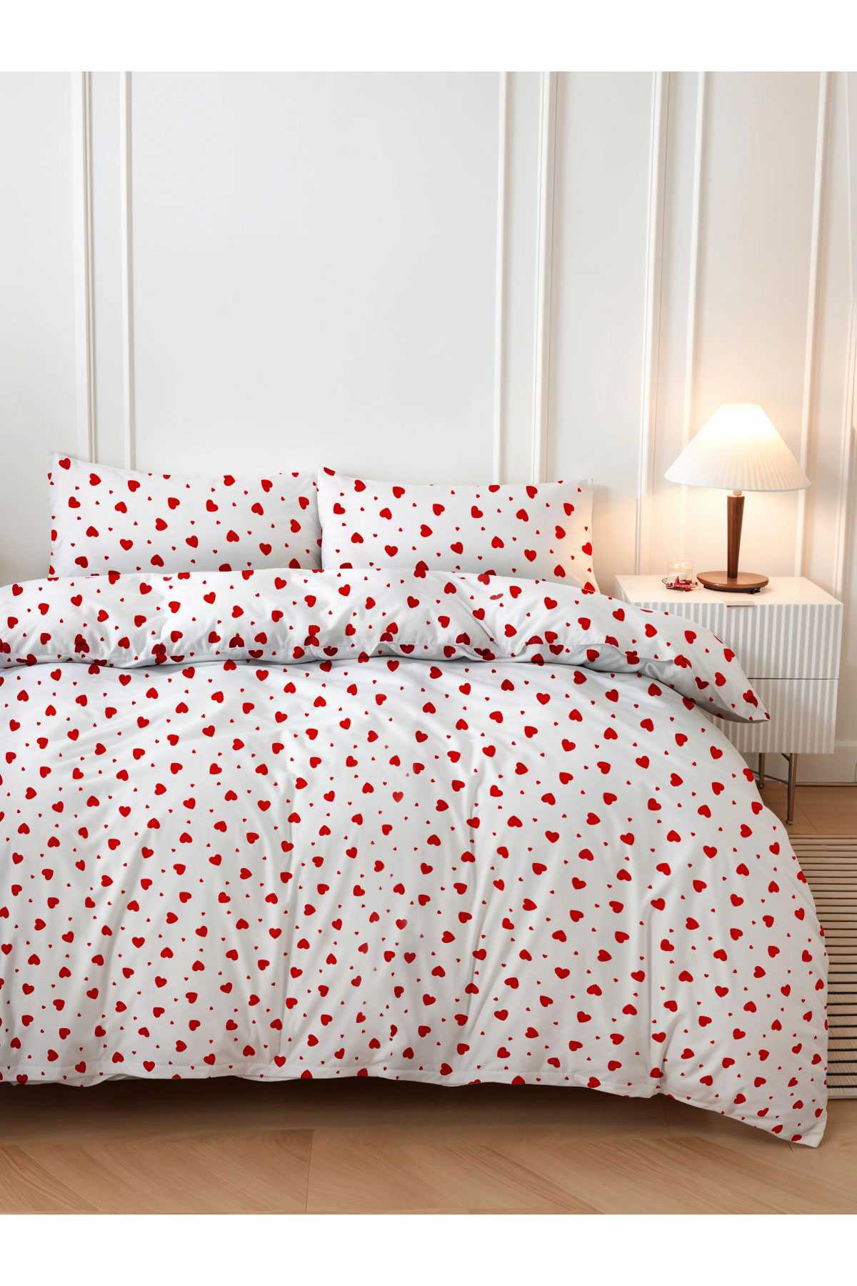 - Nevresim: 200x220 cm ölçülerinde, sevgi dolu kırmızı kalp desenleriyle süslenmiş nevresim, yatak odanıza sıcak bir atmosfer katacak.